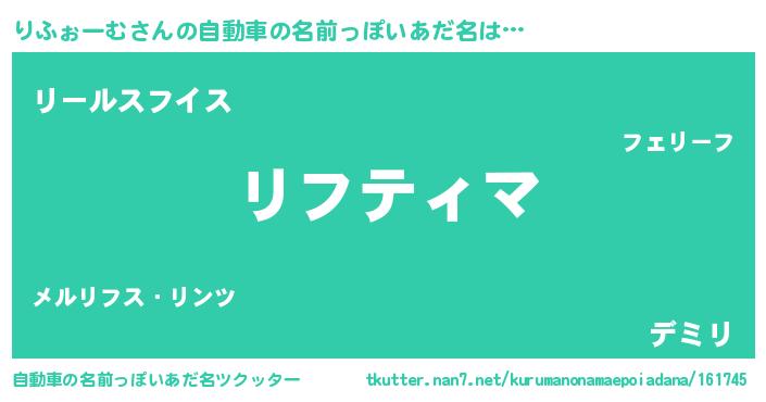 りふぉーむさんの自動車の名前っぽいあだ名は… 『リフティマ』『リールスフイス』『デミリ』 ツクッター #自動車の名前っぽいあだ名ツクッター http://tkutter.nan7.net/kurumanonamaepoiadana/161745/