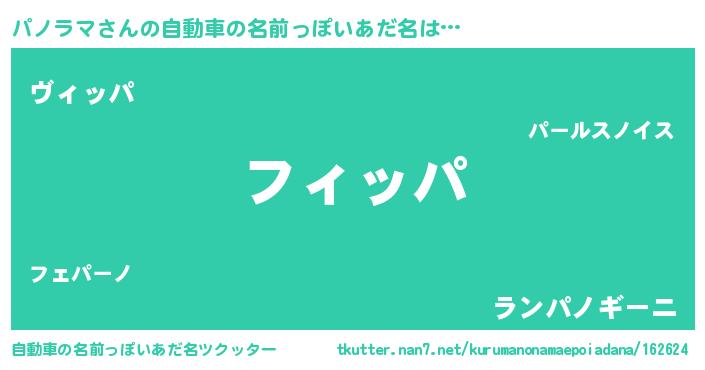パノラマさんの自動車の名前っぽいあだ名は… 『フィッパ』『ヴィッパ』『ランパノギーニ』 ツクッター #自動車の名前っぽいあだ名ツクッター http://tkutter.nan7.net/kurumanonamaepoiadana/162624/