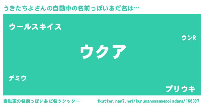 うきたちよさんの自動車の名前っぽいあだ名は… 『ウクア』『ウールスキイス』『プリウキ』 ツクッター #自動車の名前っぽいあだ名ツクッター http://tkutter.nan7.net/kurumanonamaepoiadana/166307/