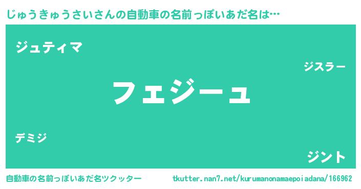 じゅうきゅうさいさんの自動車の名前っぽいあだ名は… 『フェジーュ』『ジュティマ』『ジント』 ツクッター #自動車の名前っぽいあだ名ツクッター http://tkutter.nan7.net/kurumanonamaepoiadana/166962/