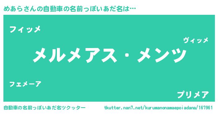 | 男性向けラノベタイトル風あだ名 | 『Re:めあらから始める異世界生活』 |