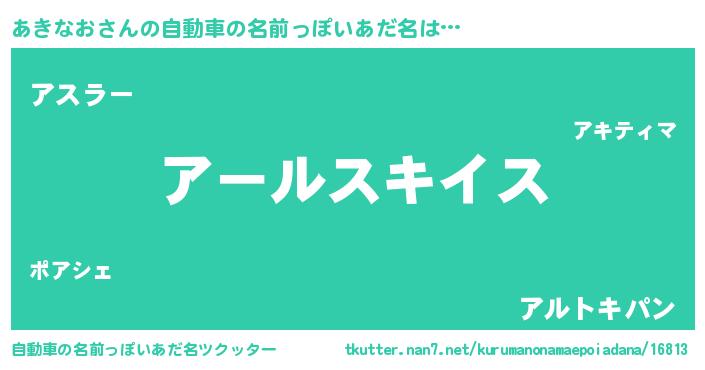 あきなおさんの自動車の名前っぽいあだ名は… 『アールスキイス』『アスラー』『アルトキパン』 ツクッター #自動車の名前っぽいあだ名ツクッター http://tkutter.nan7.net/kurumanonamaepoiadana/16813/