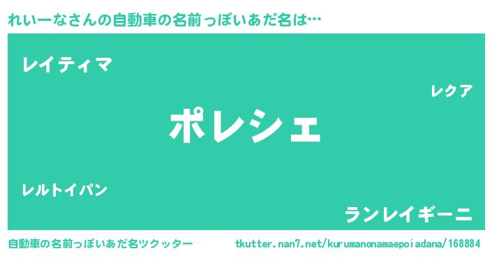 れいーなさんの自動車の名前っぽいあだ名は… 『ポレシェ』『レイティマ』『ランレイギーニ』 ツクッター #自動車の名前っぽいあだ名ツクッター http://tkutter.nan7.net/kurumanonamaepoiadana/168884/