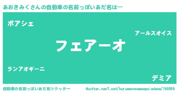 あおきみくさんの自動車の名前っぽいあだ名は… 『フェアーオ』『ポアシェ』『デミア』 ツクッター #自動車の名前っぽいあだ名ツクッター http://tkutter.nan7.net/kurumanonamaepoiadana/168958/