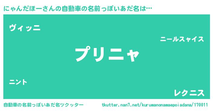 にゃんだほーさんの自動車の名前っぽいあだ名は… 『プリニャ』『ヴィッニ』『レクニス』 ツクッター #自動車の名前っぽいあだ名ツクッター http://tkutter.nan7.net/kurumanonamaepoiadana/170011/