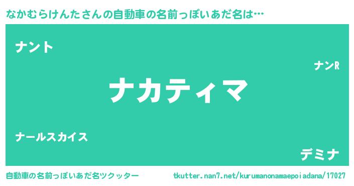 なかむらけんたさんの自動車の名前っぽいあだ名は… 『ナカティマ』『ナント』『デミナ』 ツクッター #自動車の名前っぽいあだ名ツクッター http://tkutter.nan7.net/kurumanonamaepoiadana/17027/