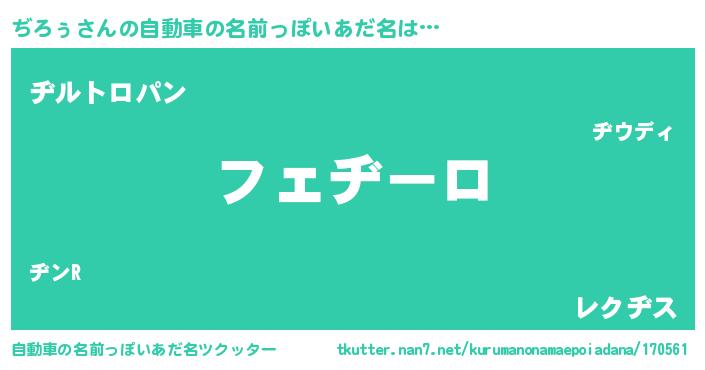 ぢろぅさんの自動車の名前っぽいあだ名は… 『フェヂーロ』『ヂルトロパン』『レクヂス』 ツクッター #自動車の名前っぽいあだ名ツクッター http://tkutter.nan7.net/kurumanonamaepoiadana/170561/