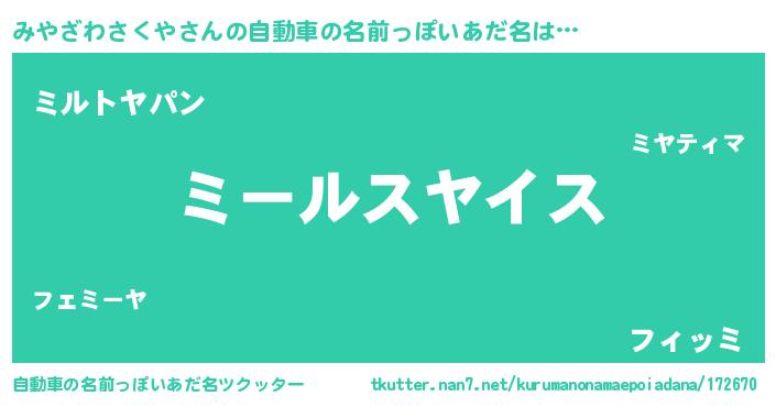 | 女子向けラノベタイトル風あだ名 | 『みやざわさくやの玉の輿計画!』 |