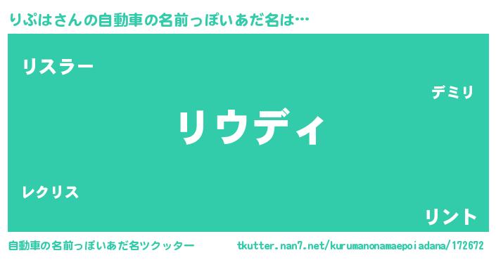 りぷはさんの自動車の名前っぽいあだ名は… 『リウディ』『リスラー』『リント』 ツクッター #自動車の名前っぽいあだ名ツクッター http://tkutter.nan7.net/kurumanonamaepoiadana/172672/