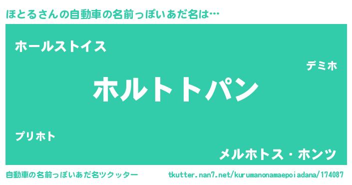 ほとるさんの自動車の名前っぽいあだ名は… 『ホルトトパン』『ホールストイス』『メルホトス・ホンツ』 ツクッター #自動車の名前っぽいあだ名ツクッター http://tkutter.nan7.net/kurumanonamaepoiadana/174087/