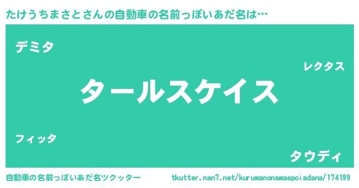 たけうちまさとさんの自動車の名前っぽいあだ名は… 『タールスケイス』『デミタ』『タウディ』 ツクッター #自動車の名前っぽいあだ名ツクッター http://tkutter.nan7.net/kurumanonamaepoiadana/174199/