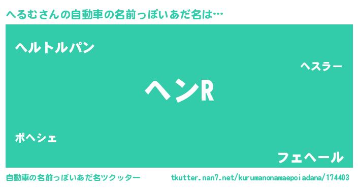 へるむさんの自動車の名前っぽいあだ名は… 『ヘンR』『ヘルトルパン』『フェヘール』 ツクッター #自動車の名前っぽいあだ名ツクッター http://tkutter.nan7.net/kurumanonamaepoiadana/174403/
