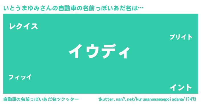 いとうまゆみさんの自動車の名前っぽいあだ名は… 『イウディ』『レクイス』『イント』 ツクッター #自動車の名前っぽいあだ名ツクッター http://tkutter.nan7.net/kurumanonamaepoiadana/17473/
