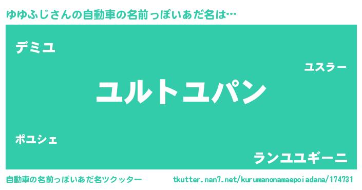 ゆゆふじさんの自動車の名前っぽいあだ名は… 『ユルトユパン』『デミユ』『ランユユギーニ』 ツクッター #自動車の名前っぽいあだ名ツクッター http://tkutter.nan7.net/kurumanonamaepoiadana/174731/
