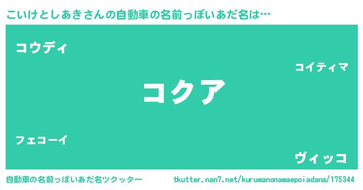こいけとしあきさんの自動車の名前っぽいあだ名は… 『コクア』『コウディ』『ヴィッコ』 ツクッター #自動車の名前っぽいあだ名ツクッター http://tkutter.nan7.net/kurumanonamaepoiadana/175344/