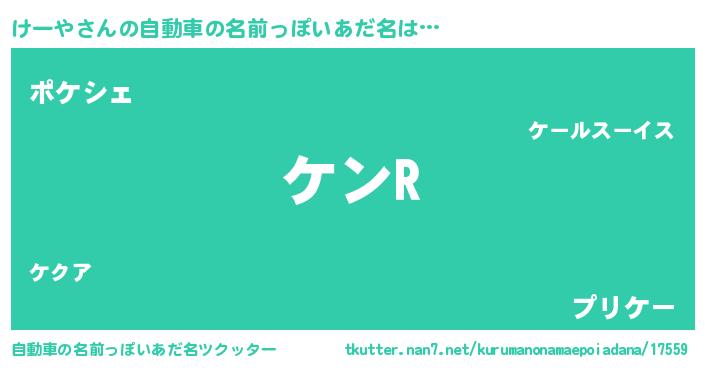 けーやさんの自動車の名前っぽいあだ名は… 『ケンR』『ポケシェ』『プリケー』 ツクッター #自動車の名前っぽいあだ名ツクッター http://tkutter.nan7.net/kurumanonamaepoiadana/17559/