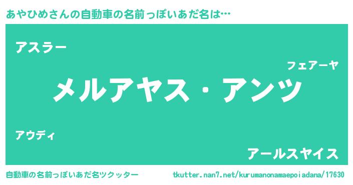 あやひめさんの自動車の名前っぽいあだ名は… 『メルアヤス・アンツ』『アスラー』『アールスヤイス』 ツクッター #自動車の名前っぽいあだ名ツクッター http://tkutter.nan7.net/kurumanonamaepoiadana/17630/