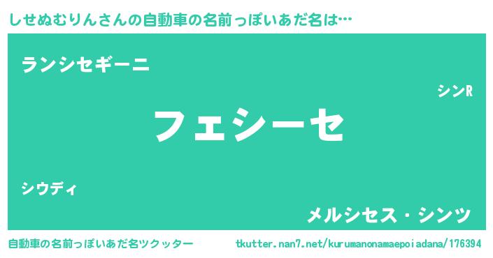 しせぬむりんさんの自動車の名前っぽいあだ名は… 『フェシーセ』『ランシセギーニ』『メルシセス・シンツ』 ツクッター #自動車の名前っぽいあだ名ツクッター http://tkutter.nan7.net/kurumanonamaepoiadana/176394/