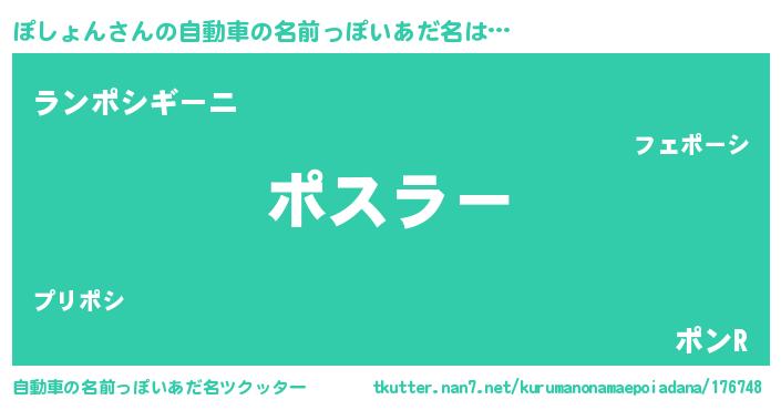 ぽしょんさんの自動車の名前っぽいあだ名は… 『ポスラー』『ランポシギーニ』『ポンR』 ツクッター #自動車の名前っぽいあだ名ツクッター http://tkutter.nan7.net/kurumanonamaepoiadana/176748/