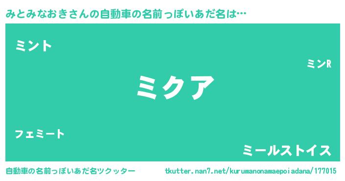 みとみなおきさんの自動車の名前っぽいあだ名は… 『ミクア』『ミント』『ミールストイス』 ツクッター #自動車の名前っぽいあだ名ツクッター http://tkutter.nan7.net/kurumanonamaepoiadana/177015/
