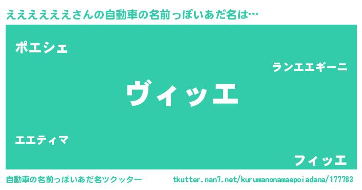 ええええええさんの自動車の名前っぽいあだ名は… 『ヴィッエ』『ポエシェ』『フィッエ』 ツクッター #自動車の名前っぽいあだ名ツクッター http://tkutter.nan7.net/kurumanonamaepoiadana/177783/