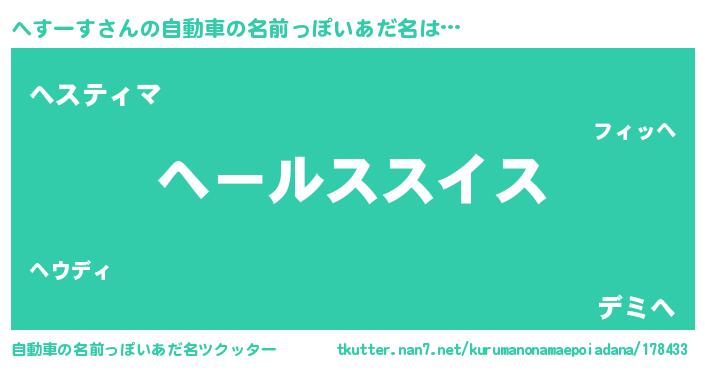 へすーすさんの自動車の名前っぽいあだ名は… 『ヘールススイス』『ヘスティマ』『デミヘ』 ツクッター #自動車の名前っぽいあだ名ツクッター http://tkutter.nan7.net/kurumanonamaepoiadana/178433/