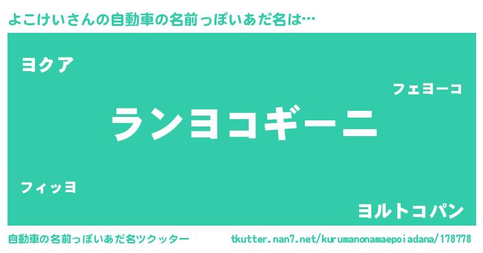 よこけいさんの自動車の名前っぽいあだ名は… 『ランヨコギーニ』『ヨクア』『ヨルトコパン』 ツクッター #自動車の名前っぽいあだ名ツクッター http://tkutter.nan7.net/kurumanonamaepoiadana/178778/