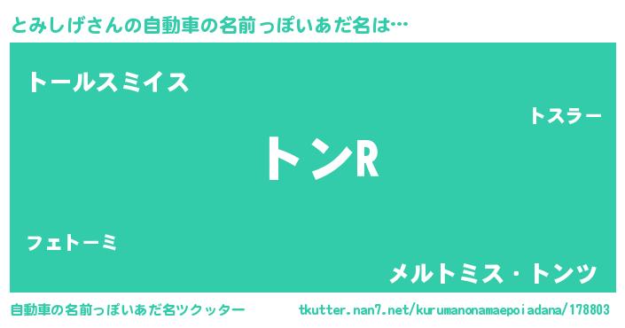 とみしげさんの自動車の名前っぽいあだ名は… 『トンR』『トールスミイス』『メルトミス・トンツ』 ツクッター #自動車の名前っぽいあだ名ツクッター http://tkutter.nan7.net/kurumanonamaepoiadana/178803/