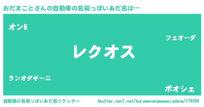 おだまことさんの自動車の名前っぽいあだ名は… 『レクオス』『オンR』『ポオシェ』 ツクッター #自動車の名前っぽいあだ名ツクッター http://tkutter.nan7.net/kurumanonamaepoiadana/179288/