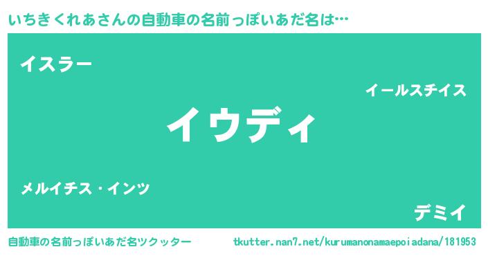 いちきくれあさんの自動車の名前っぽいあだ名は… 『イウディ』『イスラー』『デミイ』 ツクッター #自動車の名前っぽいあだ名ツクッター http://tkutter.nan7.net/kurumanonamaepoiadana/181953/