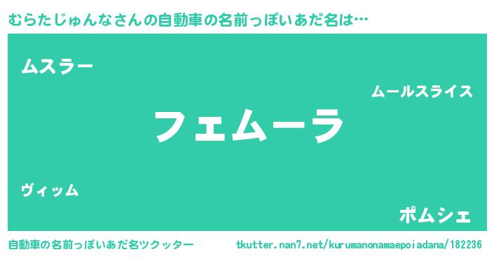 むらたじゅんなさんの自動車の名前っぽいあだ名は… 『フェムーラ』『ムスラー』『ポムシェ』 ツクッター #自動車の名前っぽいあだ名ツクッター http://tkutter.nan7.net/kurumanonamaepoiadana/182236/