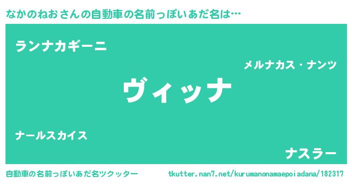 なかのねおさんの自動車の名前っぽいあだ名は… 『ヴィッナ』『ランナカギーニ』『ナスラー』 ツクッター #自動車の名前っぽいあだ名ツクッター http://tkutter.nan7.net/kurumanonamaepoiadana/182317/