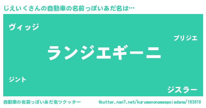 じえいくさんの自動車の名前っぽいあだ名は… 『ランジエギーニ』『ヴィッジ』『ジスラー』 ツクッター #自動車の名前っぽいあだ名ツクッター http://tkutter.nan7.net/kurumanonamaepoiadana/183010/