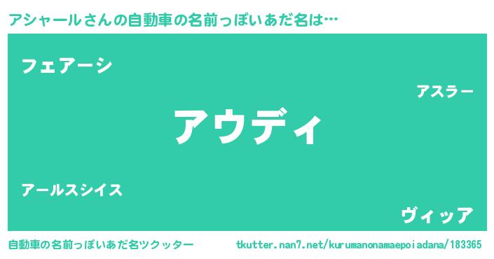 アシャールさんの自動車の名前っぽいあだ名は… 『アウディ』『フェアーシ』『ヴィッア』 ツクッター #自動車の名前っぽいあだ名ツクッター http://tkutter.nan7.net/kurumanonamaepoiadana/183365/