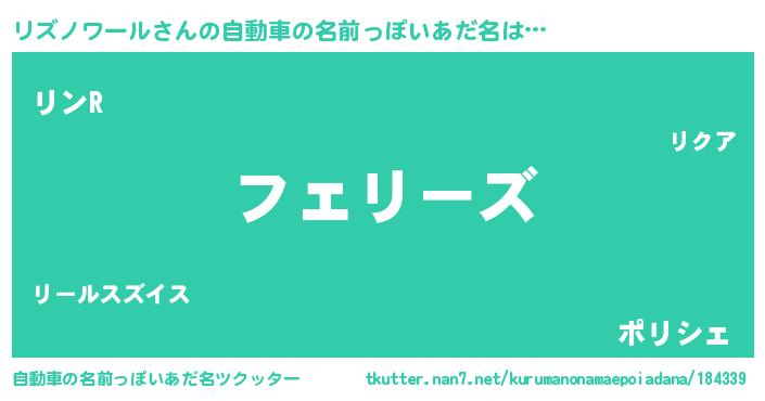 リズノワールさんの自動車の名前っぽいあだ名は… 『フェリーズ』『リンR』『ポリシェ』 ツクッター #自動車の名前っぽいあだ名ツクッター http://tkutter.nan7.net/kurumanonamaepoiadana/184339/