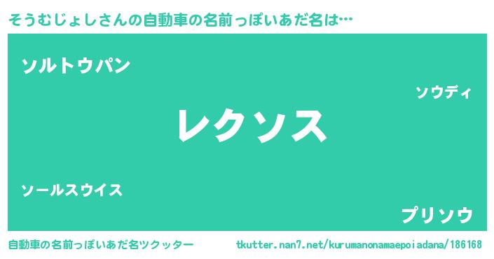 そうむじょしさんの自動車の名前っぽいあだ名は… 『レクソス』『ソルトウパン』『プリソウ』 ツクッター #自動車の名前っぽいあだ名ツクッター http://tkutter.nan7.net/kurumanonamaepoiadana/186168/
