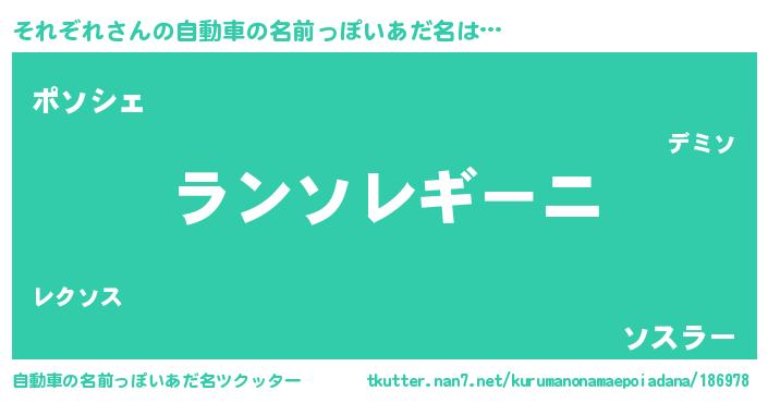 それぞれさんの自動車の名前っぽいあだ名は… 『ランソレギーニ』『ポソシェ』『ソスラー』 ツクッター #自動車の名前っぽいあだ名ツクッター http://tkutter.nan7.net/kurumanonamaepoiadana/186978/