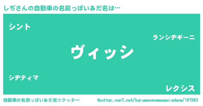 しぢさんの自動車の名前っぽいあだ名は… 『ヴィッシ』『シント』『レクシス』 ツクッター #自動車の名前っぽいあだ名ツクッター http://tkutter.nan7.net/kurumanonamaepoiadana/187583/