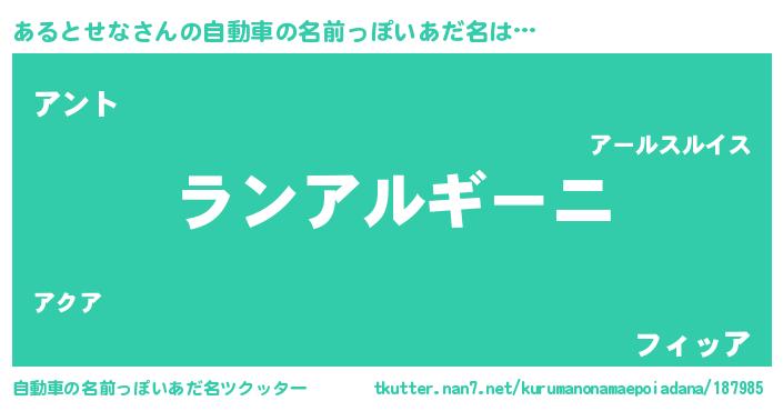 あるとせなさんの自動車の名前っぽいあだ名は… 『ランアルギーニ』『アント』『フィッア』 ツクッター #自動車の名前っぽいあだ名ツクッター http://tkutter.nan7.net/kurumanonamaepoiadana/187985/