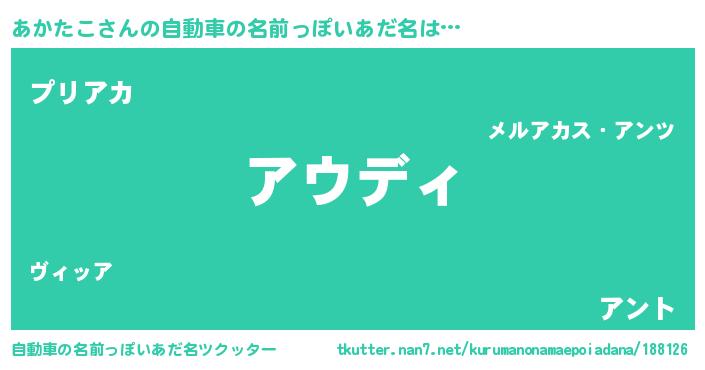 あかたこさんの自動車の名前っぽいあだ名は… 『アウディ』『プリアカ』『アント』 ツクッター #自動車の名前っぽいあだ名ツクッター http://tkutter.nan7.net/kurumanonamaepoiadana/188126/