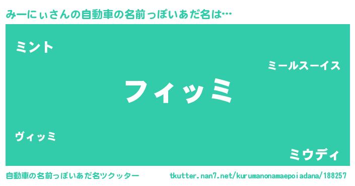 みーにぃさんの自動車の名前っぽいあだ名は… 『フィッミ』『ミント』『ミウディ』 ツクッター #自動車の名前っぽいあだ名ツクッター http://tkutter.nan7.net/kurumanonamaepoiadana/188257/