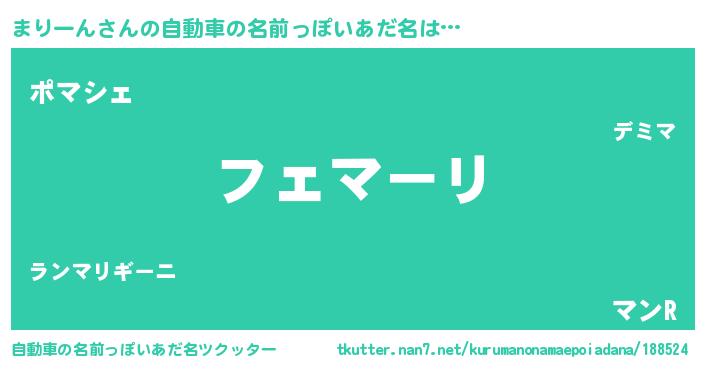 まりーんさんの自動車の名前っぽいあだ名は… 『フェマーリ』『ポマシェ』『マンR』 ツクッター #自動車の名前っぽいあだ名ツクッター http://tkutter.nan7.net/kurumanonamaepoiadana/188524/