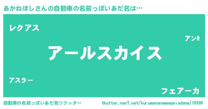 あかねほしさんの自動車の名前っぽいあだ名は… 『アールスカイス』『レクアス』『フェアーカ』 ツクッター #自動車の名前っぽいあだ名ツクッター http://tkutter.nan7.net/kurumanonamaepoiadana/18900/
