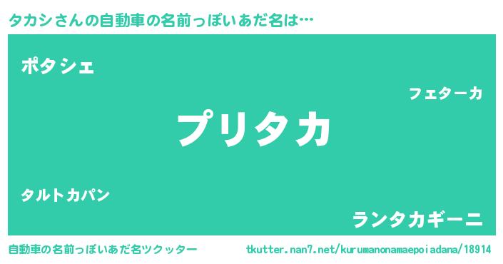 タカシさんの自動車の名前っぽいあだ名は… 『プリタカ』『ポタシェ』『ランタカギーニ』 ツクッター #自動車の名前っぽいあだ名ツクッター http://tkutter.nan7.net/kurumanonamaepoiadana/18914/