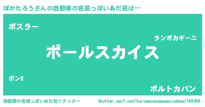 ぽかたろうさんの自動車の名前っぽいあだ名は… 『ポールスカイス』『ポスラー』『ポルトカパン』 ツクッター #自動車の名前っぽいあだ名ツクッター http://tkutter.nan7.net/kurumanonamaepoiadana/189468/