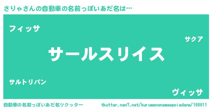 さりゃさんの自動車の名前っぽいあだ名は… 『サールスリイス』『フィッサ』『ヴィッサ』 ツクッター #自動車の名前っぽいあだ名ツクッター http://tkutter.nan7.net/kurumanonamaepoiadana/190011/