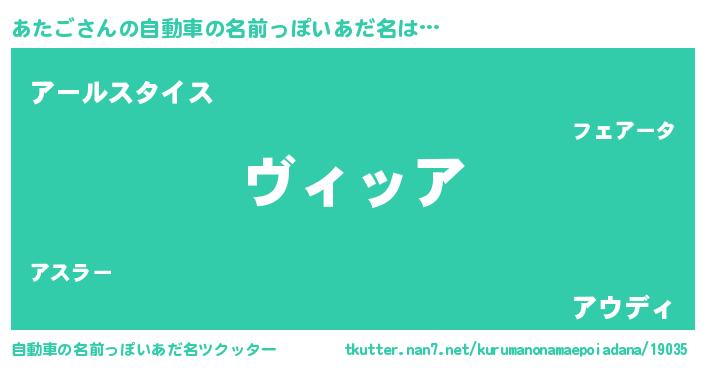 あたごさんの自動車の名前っぽいあだ名は… 『ヴィッア』『アールスタイス』『アウディ』 ツクッター #自動車の名前っぽいあだ名ツクッター http://tkutter.nan7.net/kurumanonamaepoiadana/19035/