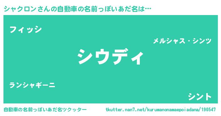 シャクロンさんの自動車の名前っぽいあだ名は… 『シウディ』『フィッシ』『シント』 ツクッター #自動車の名前っぽいあだ名ツクッター http://tkutter.nan7.net/kurumanonamaepoiadana/190547/