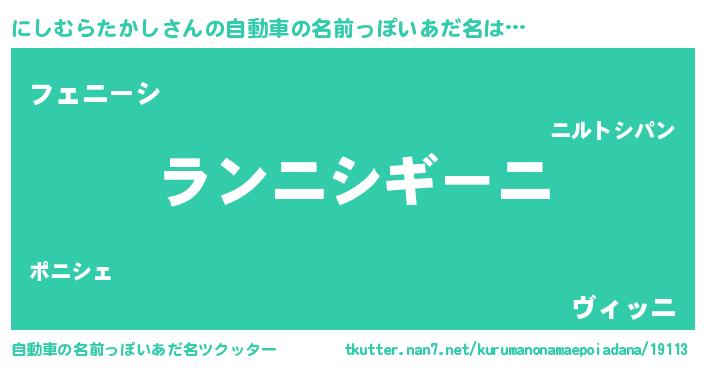 にしむらたかしさんの自動車の名前っぽいあだ名は… 『ランニシギーニ』『フェニーシ』『ヴィッニ』 ツクッター #自動車の名前っぽいあだ名ツクッター http://tkutter.nan7.net/kurumanonamaepoiadana/19113/