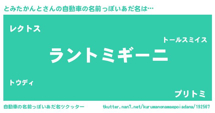 とみたかんとさんの自動車の名前っぽいあだ名は… 『ラントミギーニ』『レクトス』『プリトミ』 ツクッター #自動車の名前っぽいあだ名ツクッター http://tkutter.nan7.net/kurumanonamaepoiadana/192567/